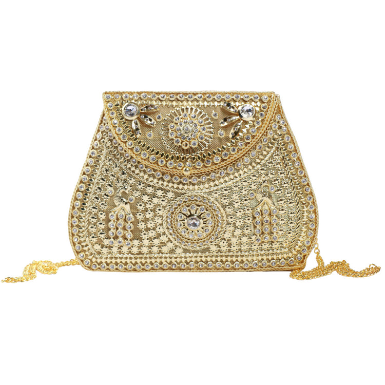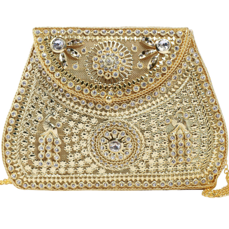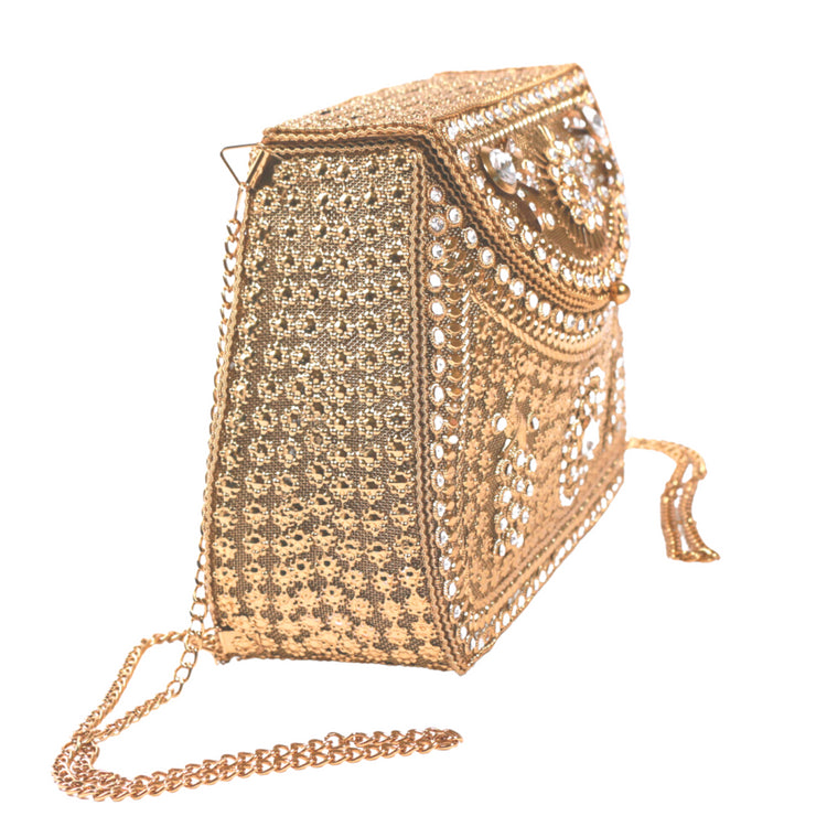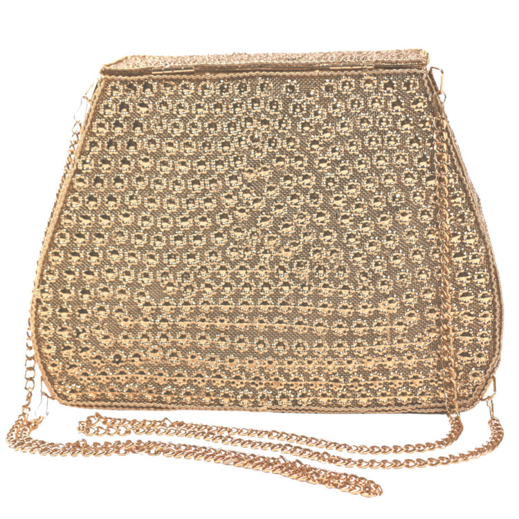 A stunning gold accessory, designed to add glamour to any occasion. This elegant clutch features a sleek metallic finish that captures and reflects light, creating a mesmerizing, radiant effect. Equipped with a long chain, it can be worn as a body bag for versatile styling, seamlessly transitioning from a chic clutch to a hands-free accessory.