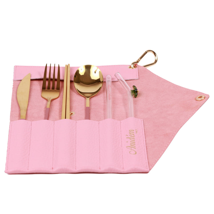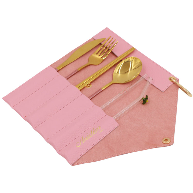 Elevate your dining experience on the go with this elegant pink cutlery set from House of Anidem. Featuring gold-toned utensils and crystal straws, this beautifully designed case is compact, stylish, and perfect for sustainable dining with a touch of luxury.