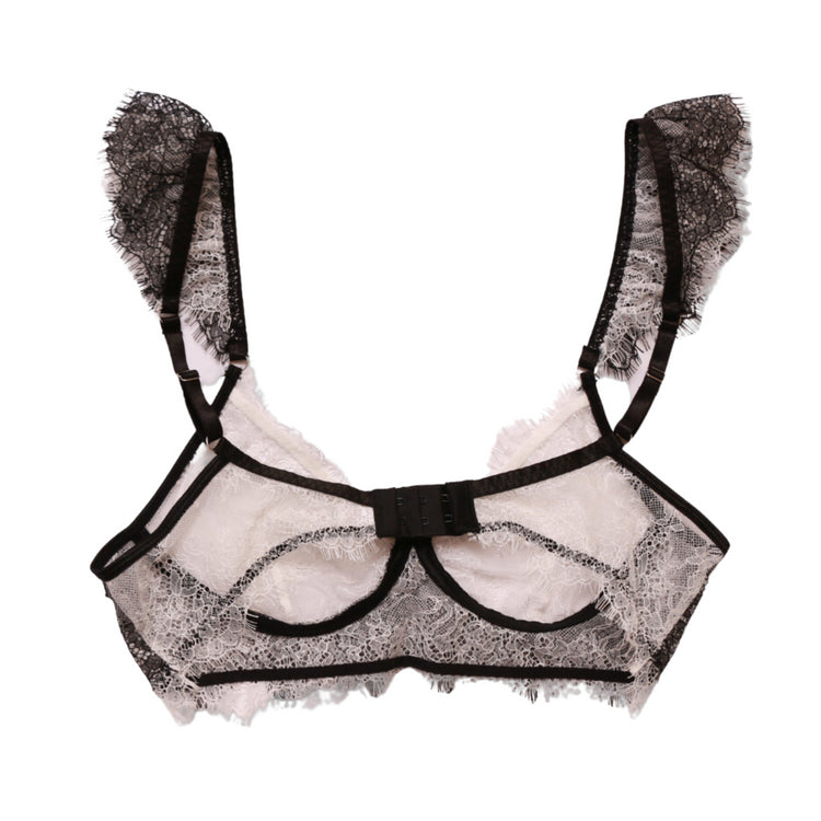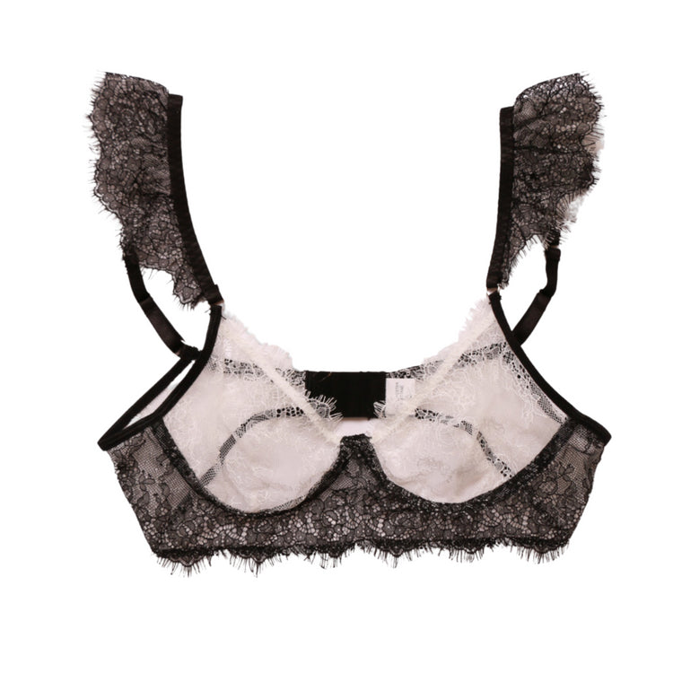 Indulge in the allure of our Sheer Mesh Bra Set, designed to combine elegance with sensuality. The bralette features delicate ruffle trim and soft stretch lace on the shoulder straps and tops of the cups, creating a beautifully feminine silhouette. The accompanying thong panties showcase a solid crotch with a sheer mesh front panel, sides, and back, complemented by elastic along the legs for a comfortable fit.