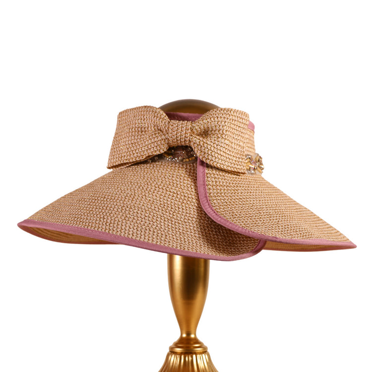 Experience elevated style with our open-top straw sun visor, adorned with exquisite crystal accents for a touch of sparkle. The unique open-top design, highlighted by a refined crystal-embellished bowknot, offers versatile styling options—even with a ponytail.